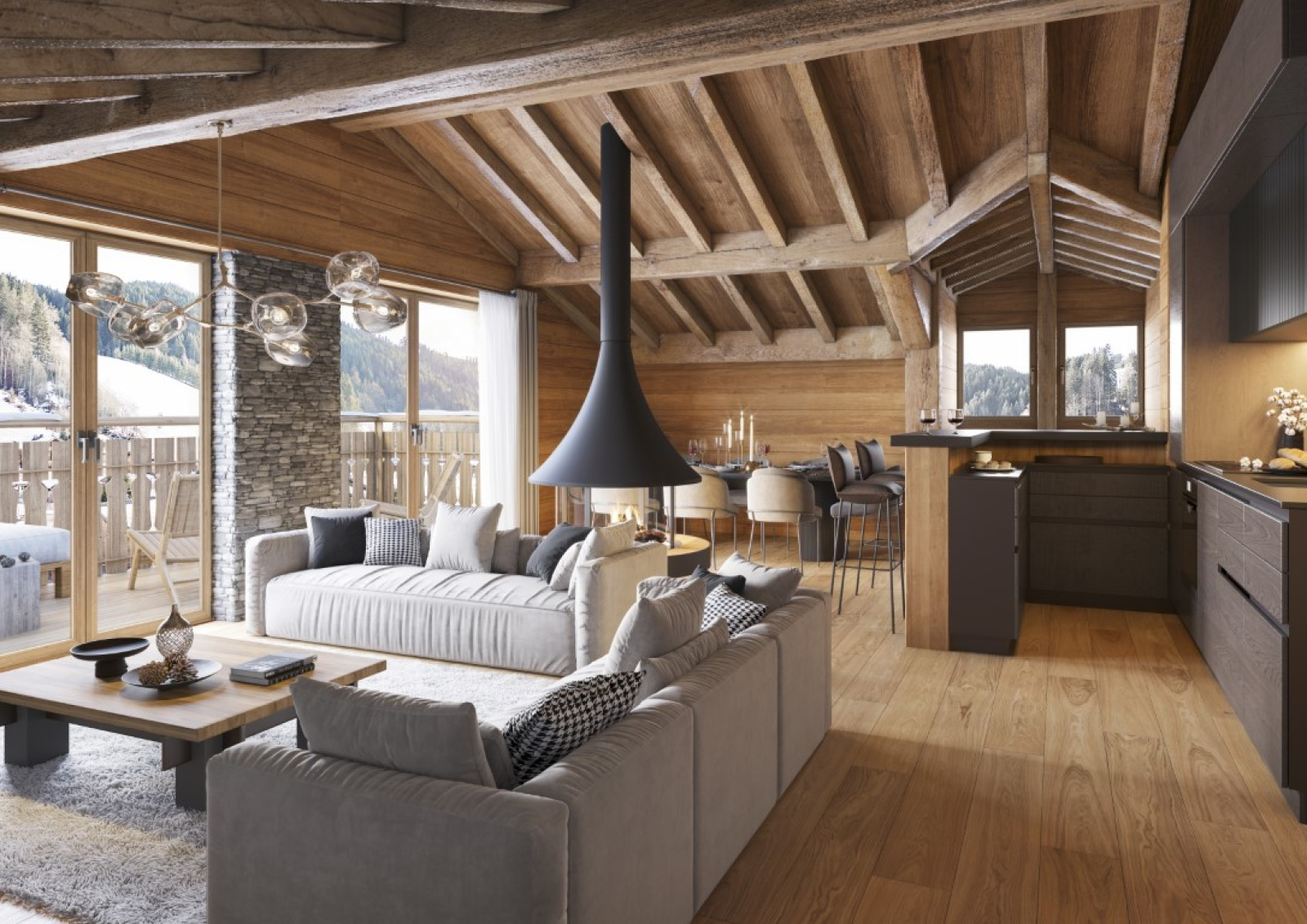 Quant aux prestations, COTTAGE ALPIN allie tradition et modernité. Le mariage harmonieux du bois et de la pierre apporte chaleur et vous invite à découvrir l’atmosphère d’un vrai chalet de famille agrémenté de prestations haut de gamme. Grâce aux baies vitrées, la place apportée à la lumière naturelle joue un rôle prépondérant dans cette réalisation qui multiplie les ouvertures pour profiter de la vue et de l’ensoleillement.